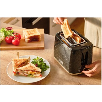 Toster elektryczny Sencor STS7201BK w kolorze czarnym z elegancką strukturą plastra miodu i złotą wstawką doda blasku Twojej kuchni. Stwórz zestaw wraz z czajnikiem SWK7201BK i ciesz się przyrządzaniem ulubionego posiłku z chrupiącym tostem i gorcym napojem.