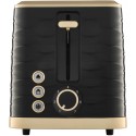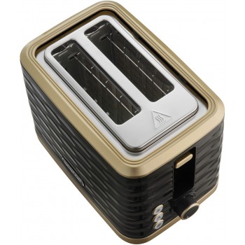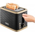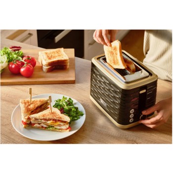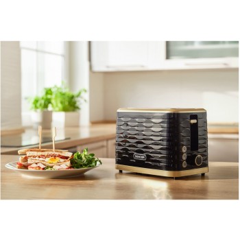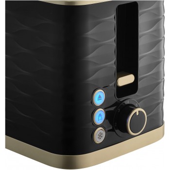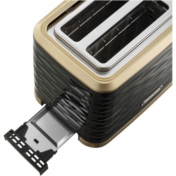 Toster elektryczny Sencor STS7501BK w kolorze czarnym z elegancką strukturą fali i złotymi wykończeniami doda blasku Twojej kuchni. Stwórz zestaw wraz z czajnikiem SWK7501BK i ciesz się przyrządzaniem ulubionego posiłku z chrupiącym tostem i gorcym napojem.
