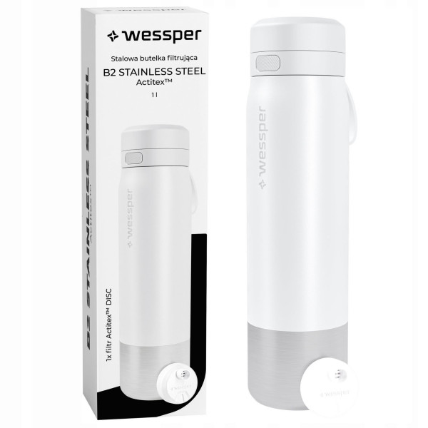 Filtracja Actitex™ DISC – technologia, która poprawia smak wody i redukuje zanieczyszczeniaButelka Wessper B2 STAINLESS STEEL wyposażona jest w nowoczesny filtr Actitex™ DISC, oparty na mikroporowatej włókninie węglowej — rozwiązaniu objętym patentem. Dzięki temu filtr jest wyjątkowo gęsty i skuteczny, a przy tym kompaktowy. Jak działa filtr?