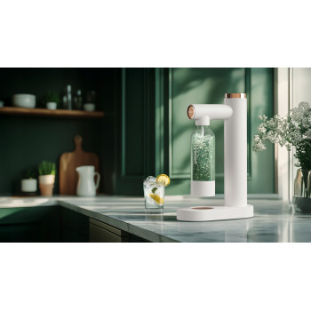 2. Naciśnij przycisk CO2 (znajduje się w górnej części urządzenia). Przytrzymaj ok. 2-3 sekundy, aby zmienić wodę z kranu w orzeźwiający napój.