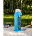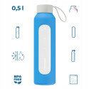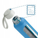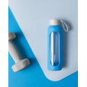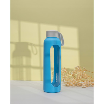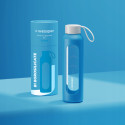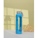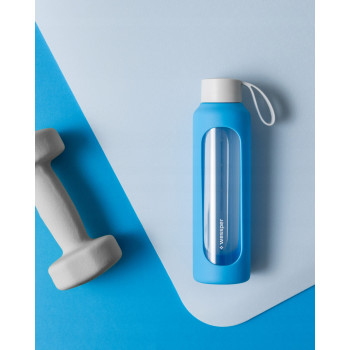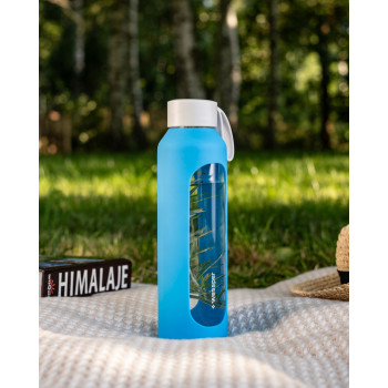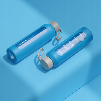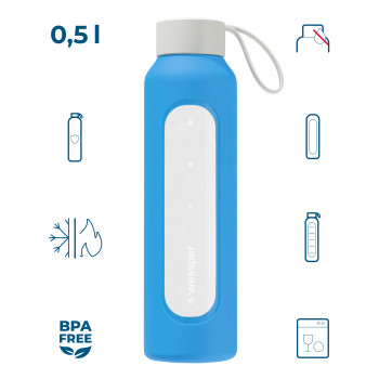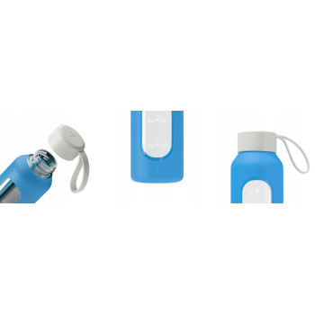 Całość uzupełnia dopasowane silikonowe etui w eleganckim kolorze błękitnym, które nie tylko chroni szkło, ale też poprawia chwyt i nadaje butelce nowoczesny, wyrazisty wygląd. Dla tych, którzy lubią zmieniać – dostępne są również wymienne etui w innych kolorach, pozwalające personalizować butelkę zgodnie z upodobaniami lub stylem.